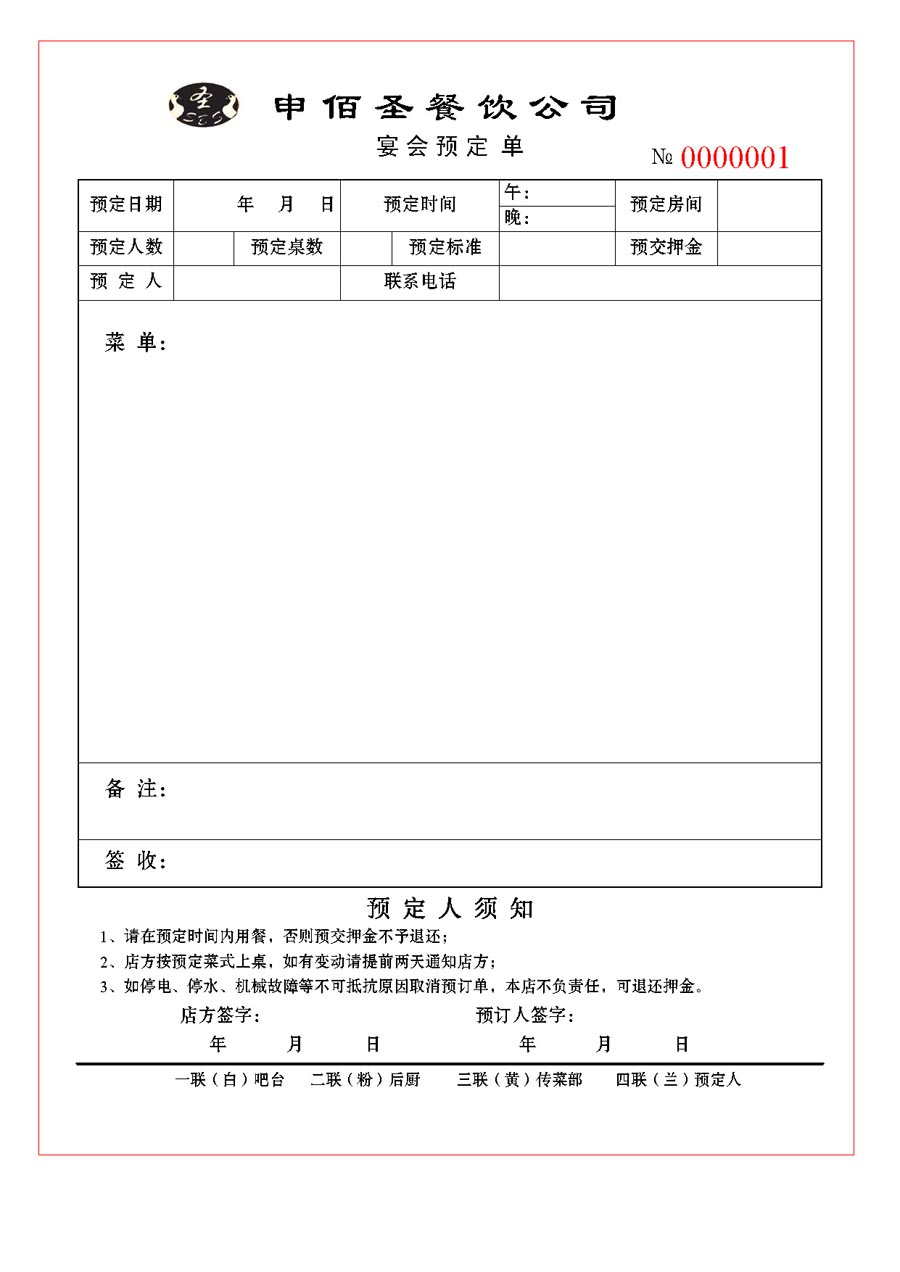 申佰圣宴会预订单