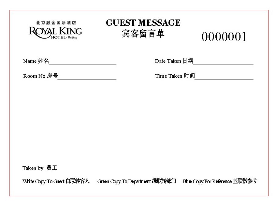 融金酒店 宾客留言单