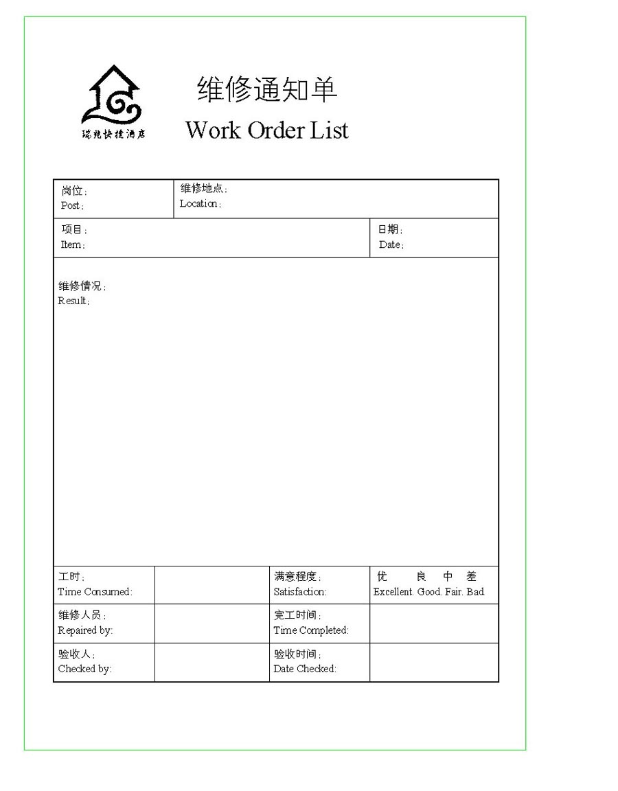 瑞兆酒店 维修通知单