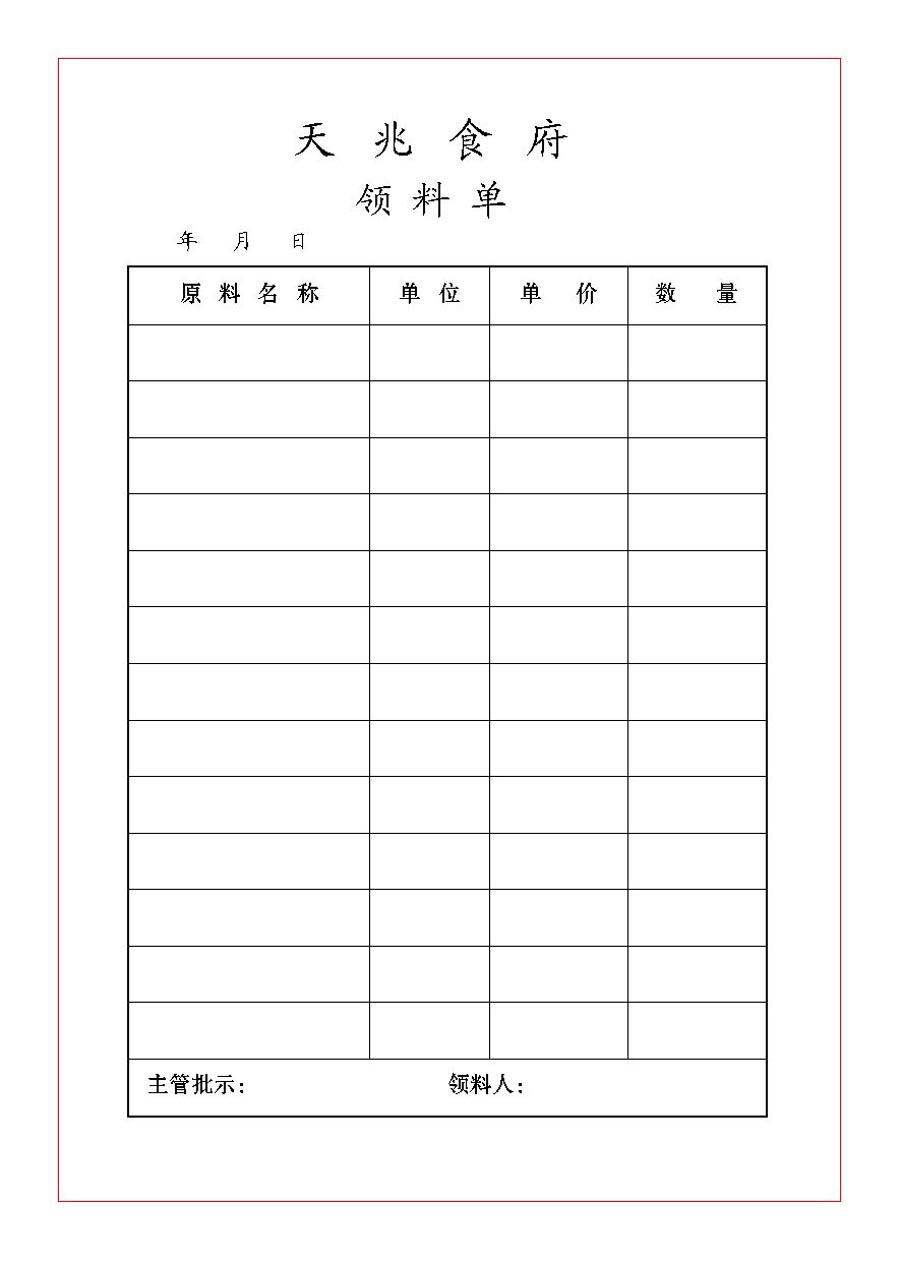 天兆食府领料单
